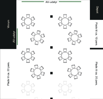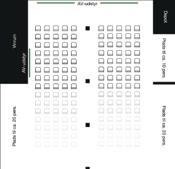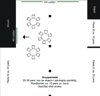 Er I en gruppe mellem 20-35 personer, har vi mulighed for at lave en opstilling foran vore, AV-udstyr i øjenhøjde – både med og uden borde.